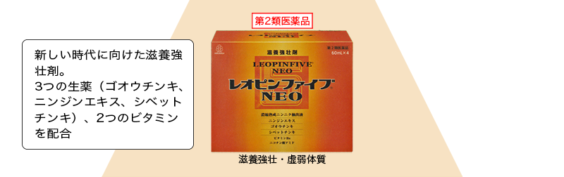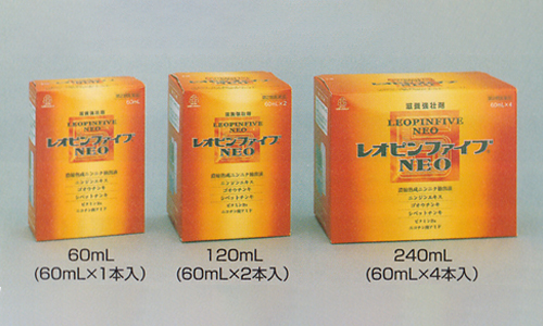 • レオピンファイブネオは、ニンニクを長時間かけ抽出・熟成し、濃縮して得られた濃縮熟成ニンニク抽出液に、ニンジンエキス、ゴオウチンキ、シベットチンキ、ビタミンB6及びニコチン酸アミドを配合した滋養強壮剤です。