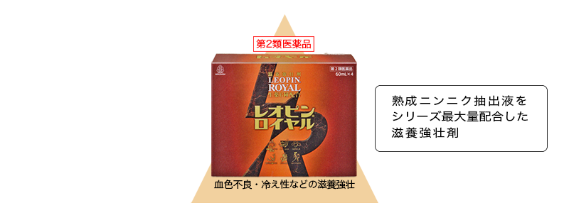 • レオピンロイヤルは、濃縮熟成ニンニク抽出液やニンジンエキスなど6種の生薬を配合した医薬品で、血液の流れをよくして血色不良や冷え症を改善するとともに、虚弱体質や肉体疲労時などにもすぐれた効果をあらわす滋養強壮剤です。