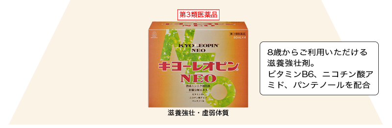 • キヨーレオピンネオは、ニンニクを長期間かけ抽出・熟成して得られた熟成ニンニク抽出液に、肝臓分解エキスやビタミンB6、ニコチン酸アミド、パンテノールを配合した滋養強壮剤です。